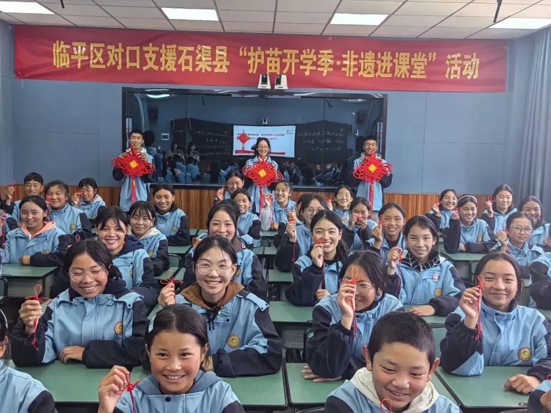 悠悠古韵,千千结艺。中国结是我国传统文化的一个重要元素,它寓意着团结幸福平安。为传承中华民族传统文化,弘扬爱国主义精神,让石渠青少年深刻体验非遗技艺,推进文化自信自强,9月5日,临平滴水公益志愿者前往石渠县邓柯中学,开展“护苗开学季·非遗进课堂”活动,带领该校学生学习编织中国结,亲身感受绳结魅力,体会中华民族特有的艺术智慧和纯粹的文化精髓。