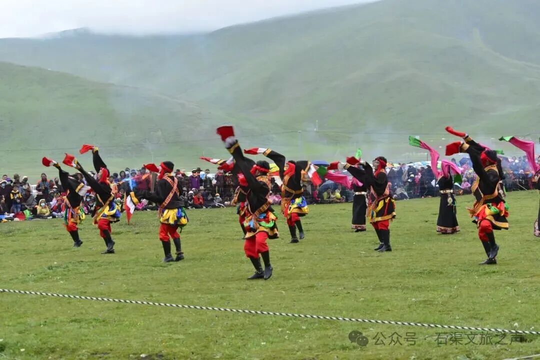 锅庄即圆圈舞,其产生可追溯到一千多年前的吐番王国时期,源于民间祭祀活动,后经千百年演变和发展变化成为广大农牧民群众家喻户晓的民间文艺形式。 石渠锅庄主要分牧区锅庄和农区锅庄两大流派。牧区锅庄以西区锅庄为代表,其动作舒展奔放,具有热烈、活泼、开朗的特色。农区锅庄以真达锅庄为代表,其动作剽悍、雄健、粗犷,具有很强的动感。