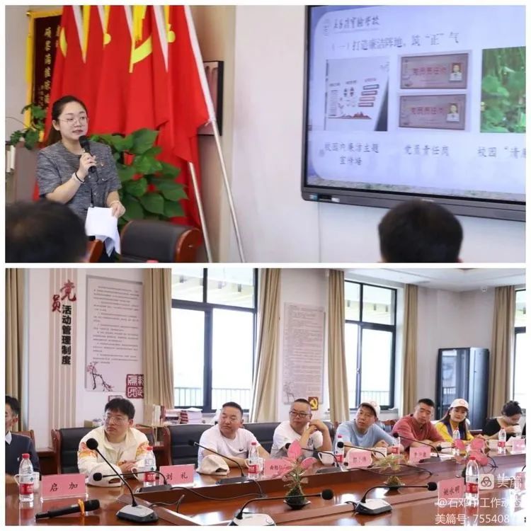 参观后,两校又在党务工作上进行了深入的交流与研讨。吴昌硕实验学校党务工作者陈超怡老师,向我县交流团一行作了“清风和润校园,廉植和美昌硕”清廉学校示范点创建的主题报告。