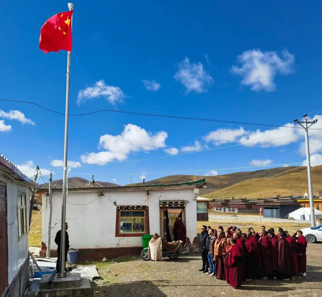 仪式现场,寺庙僧尼排着整齐的队伍,神情严肃恭敬、气氛庄严肃穆,鲜艳的五星红旗伴随着激昂慷慨的国歌声在旭日的照耀下冉冉升起,所有人向国旗行注目礼、齐唱国歌,以昂扬姿态向祖国表达崇高敬意,献上对党和祖国最美好的祝福。